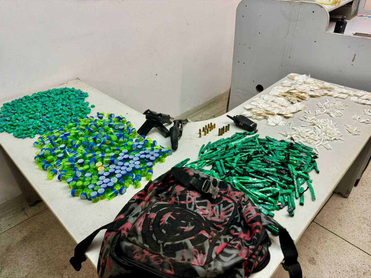 Em uma mochila que estava com eles foram encontradas mais de 700 porções de cocaína, 1400 porções de maconha e um rádio comunicador. Além disso, os policiais também apreenderam duas armas usadas pelos criminosos e várias cápsulas caídas no chão.