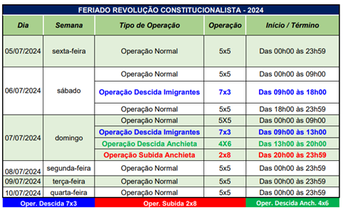 É esperado um aumento no fluxo de veículos em direção à Baixada Santista a partir do dia 6 de julho (sábado), das 9h às 18h, e no dia 7 de julho (domingo), das 9h às 13h. Durante esse período, será implantada a Operação Descida (7×3), na qual os veículos utilizarão as pistas Norte e Sul da Via Anchieta, além da pista Sul da Rodovia dos Imigrantes para descerem em direção ao litoral. A subida será realizada exclusivamente pela pista Norte da Imigrantes.