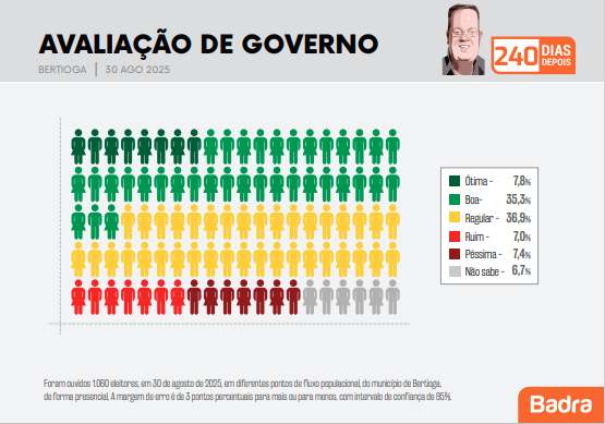 Em relação à avaliação do governo, 7,8% consideram ótimo, 35,3% consideram bom e 36,9% regular. Cerca de 24,7% reprovam a forma do político de governar a cidade e 18,8% não souberam responder se aprovam ou não a gestão.
