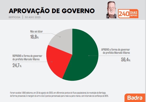 Segundo pesquisa do Instituto Badra, o prefeito de Bertioga, Marcelo Vilares, tem a aprovação de 56,4% da população em relação aos primeiros oito meses de mandato ano.