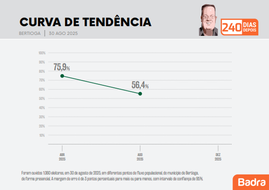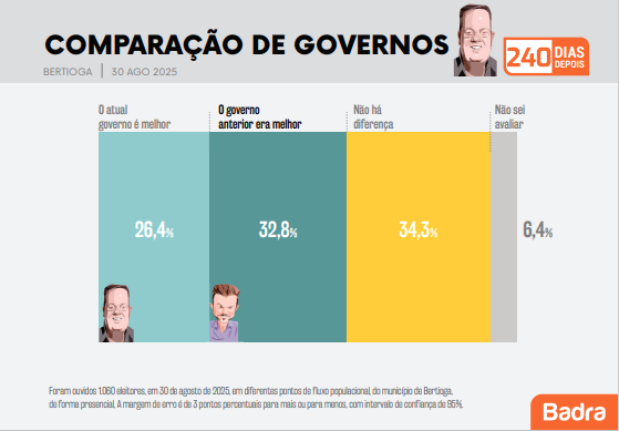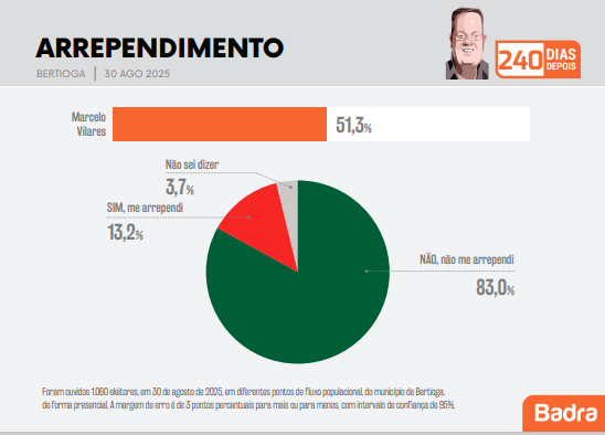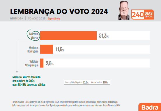 Foram ouvidos 1.060 eleitores no dia 30 de agosto de 2025, a partir de 16 anos até mais de 60, em diferentes pontos do município de Bertioga, de forma presencial.