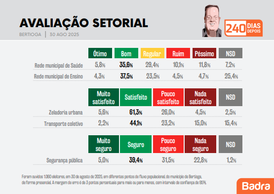 Na zeladoria, 61,3% estão satisfeitos, assim como no transporte público, que 44,1% da satisfação dos entrevistados. Na segurança pública, 39,4% se sentem seguros, enquanto 31,5% se sentem pouco seguros.
