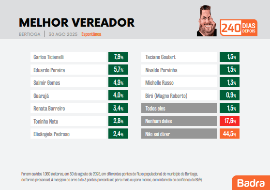 Além dos questionamentos em relação a gestão do prefeito, também foram questionados os melhores vereadores da cidade, confira abaixo:
