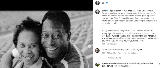 O rei do futebol, pouco antes de morrer, aos 82 anos, prestou uma linda homenagem à mãe pelos seus 100 anos de idade, em 20 de novembro de 2022. “Desde criancinha, ela me ensinou o valor do amor e da paz. Eu tenho muito mais de uma centena de motivos para agradecer por ser o seu filho. Compartilho essas fotos com vocês, com muita emoção por celebrar este dia. Obrigado por todos os dias ao seu lado, mãe”, escreveu Pelé em suas redes sociais.