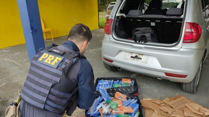 Durante a fiscalização dos equipamentos obrigatórios e dos elementos identificadores do veículo a equipe da PRF constatou que havia um forte odor característico de maconha no interior do automóvel. Diante da suspeita os policiais realizaram uma vistoria mais detalhada e encontraram um mala com vários tabletes de maconha.