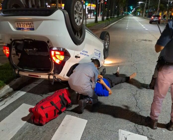 Um motorista ficou ferido após bater e capotar o carro na madrugada deste domingo (7) em Santos, no litoral de São Paulo. Segundo o Corpo de Bombeiros, a vítima estava sozinha no veículo e foi retirada por testemunhas.