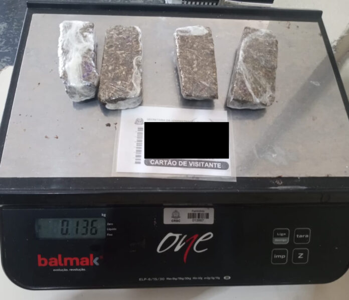 A apreensão aconteceu no momento da inspeção com o aparelho de escâner corporal. Servidoras da unidade prisional notaram anormalidades nas imagens captadas pelo equipamento. A jovem admitiu que trazia droga em sua roupa íntima e voluntariamente entregou para as policiais penais quatro barras de maconha, pesando ao todo, 136 gramas. O ilícito estava escondido junto ao sutiã da visitante.