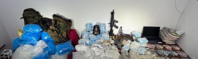 O homem em questão foi abordado, e confessou que usava o imóvel para armazenar entorpecentes. No local foram apreendidos: uma submetralhadora .9mm com a numeração raspada, uma pistola calibre .40, munições de diferentes calibres, carregadores e porta carregador, além de 20,481kg de cocaína, 50 litros de lança-perfume, aparelhos celulares, um pedaço de haxixe, um saco e 60 pinos com K2, 3,313kg de maconha e 872g de crack.
