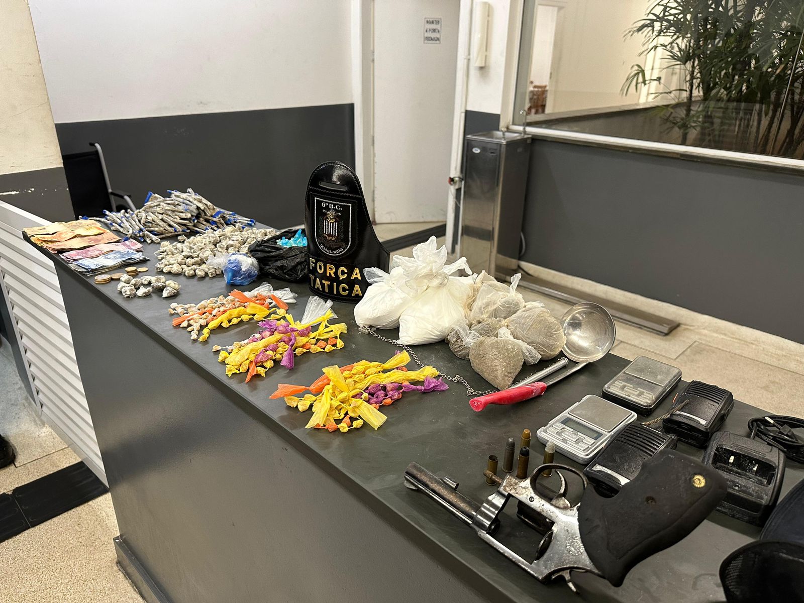 Junto com o suspeito, foi localizado um revólver calibre 38 com 1 cápsula deflagrada e 4 intactas, além de uma quantidade de entorpecente. Todo conteúdo foi apreendido. As armas do suspeito e dos policiais foram encaminhadas para perícia e o caso foi registrado na Central de Polícia Judiciária de Santos.
