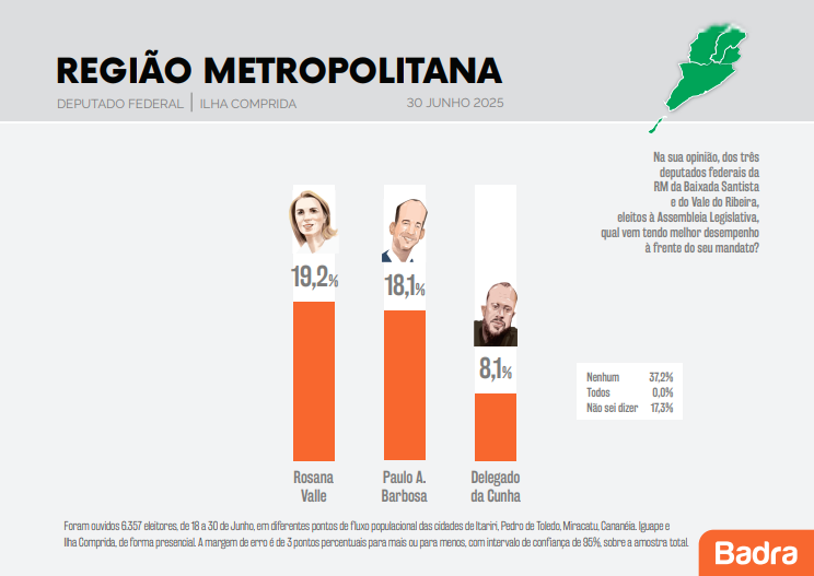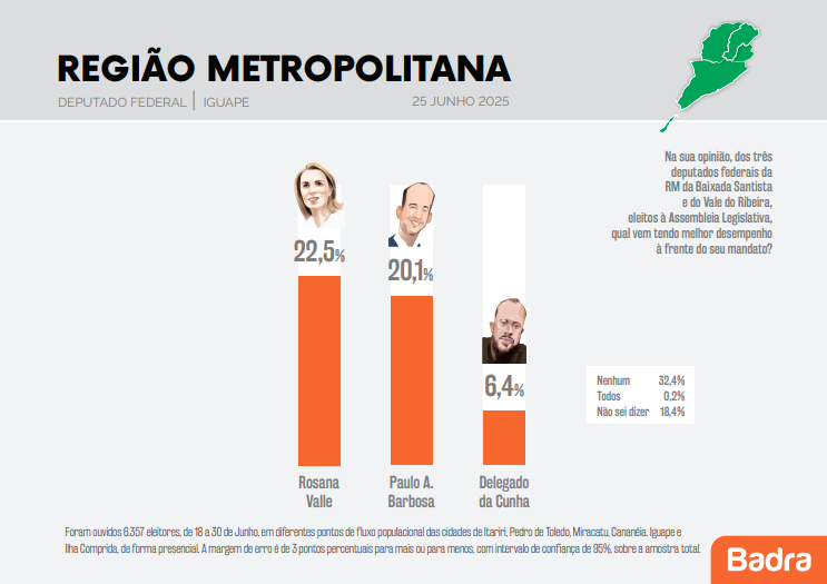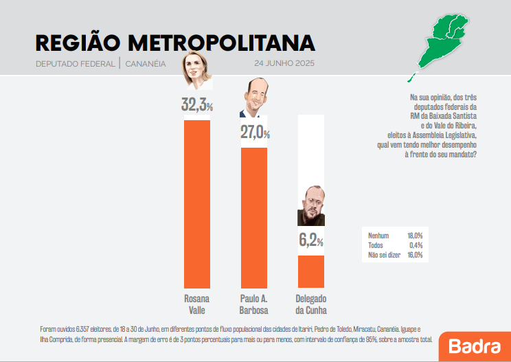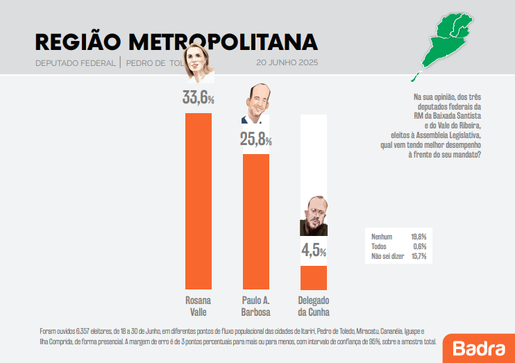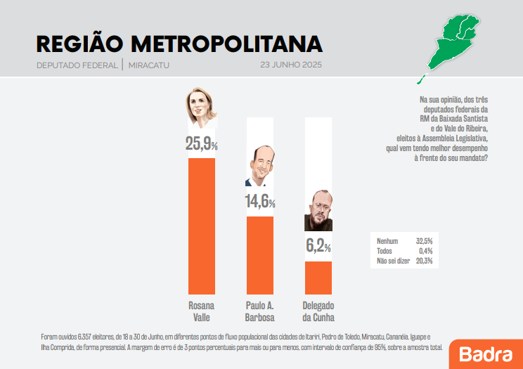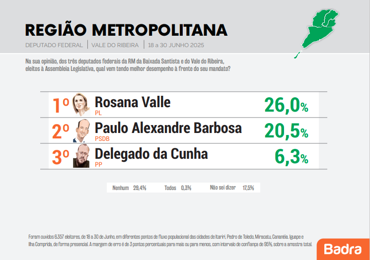 Uma pesquisa realizada pelo Instituto Badra traz a avaliação dos eleitores do Vale do Ribeira em relação a atuação dos mandatos dos deputados federais da região, Rosana Valle (PL), Paulo Alexandre Barbosa (PSDB) e Delegado Da Cunha (PP).