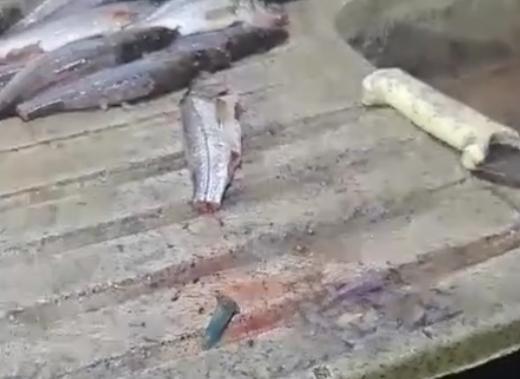 O encontro dos pinos de droga dentro do estômago de um peixe, durante o processo de descamação e limpeza do animal, chamou a atenção dos envolvidos. “É os que jogam dentro do rio aí, como é que pode”, comenta um dos pescadores sobre a poluição.