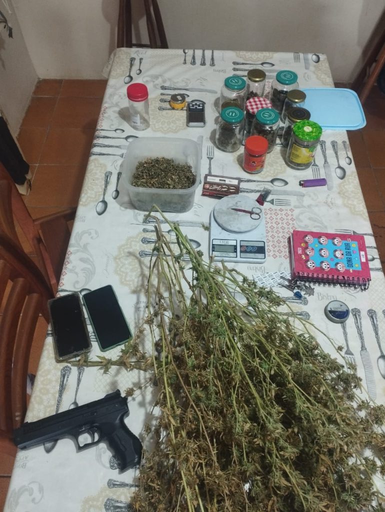 Ao todo foram apreendidos 25 vasos com a substância ilícita e diversos objetos como potes de vidros, um de plástico com a maconha já colhida, duas balanças e um simulacro de arma de fogo. O homem foi preso em flagrante e encaminhado à cadeia pública.
