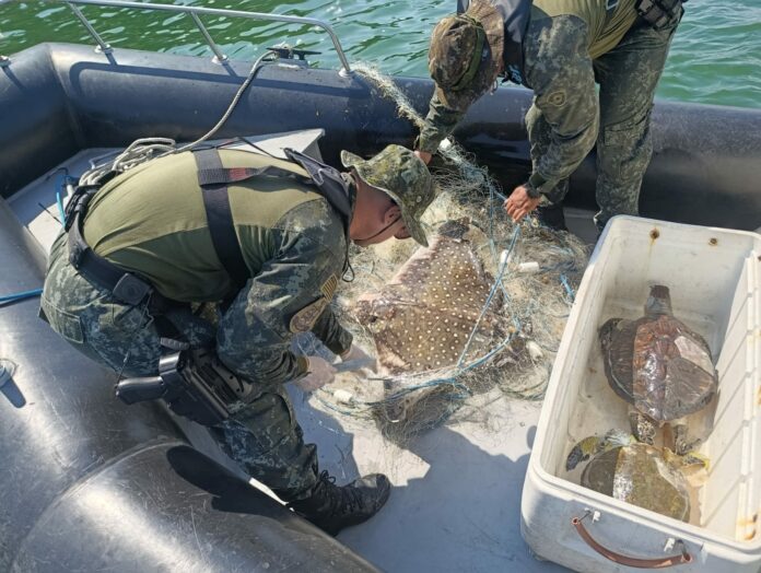 Durante a averiguação, os agentes encontraram quatro tartarugas marinhas e uma arraia da espécie conhecida como “chita” presas à rede sem vida.