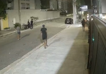 Logo depois, outros dois comparsas atravessam a rua e abordam outras duas pessoas que estavam ao lado de uma moto e roubam os pertences das vítimas. Durante a ação, o funcionário da pousada que estava ao lado da moto levou um tapa na cara.