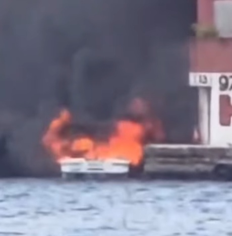 Uma embarcação de pequeno porte pegou fogo na tarde desta quinta-feira (8), em uma marina, na Rua Japão, em São Vicente.