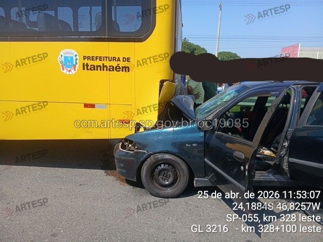 Uma colisão entre um carro e um ônibus deixou o motorista do veículo em estado grave ao ficar preso nas ferragens. O acidente aconteceu na manhã de sábado (25), por volta das 08h28, na Rodovia Padre Manoel da Nóbrega, em Itanhaém.