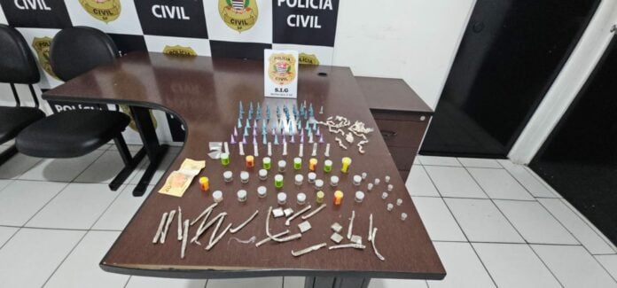 Na diligência, um homem foi visto entregando drogas a um usuário. Ao se aproximarem para a abordagem, o olheiro gritou e fez gestos que ajudaram o traficante principal a fugir, mas não conseguiu evitar a apreensão da sacola arremessada, que tinha 40 porções de cocaína, 26 de maconha, 25 de flor, 32 de K2, 10 de Dry e 64 pedras de crack, além de R$ 20,00 em espécie.