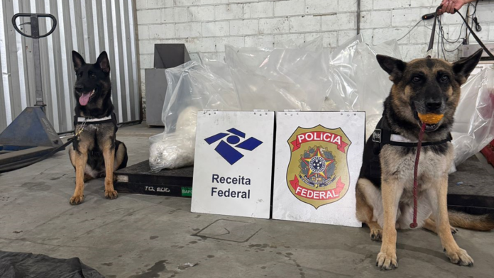 litros. A interceptação ocorreu durante ações rotineiras de vigilância por equipes da Alfândega de Santos. Os cães farejadores contribuíram com a ação sinalizando que teriam entorpecentes no local.