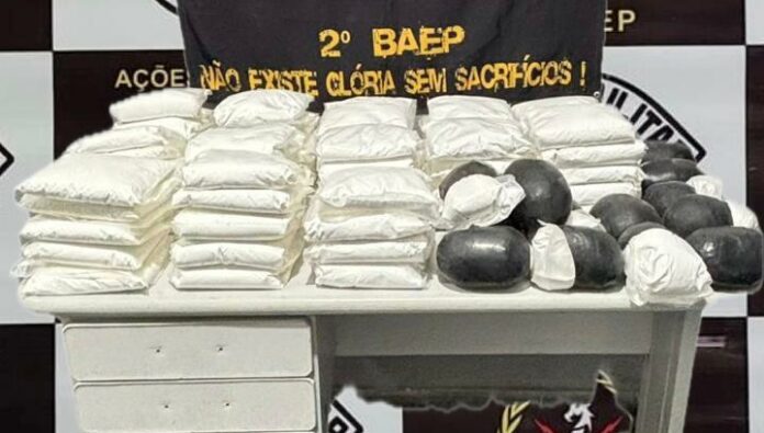 Durante a incursão na mata, os policiais localizaram mochilas escondidas dentro de uma gruta. No interior delas, foi encontrada uma grande quantidade de pasta base de cocaína, totalizando 77 quilos da substância.