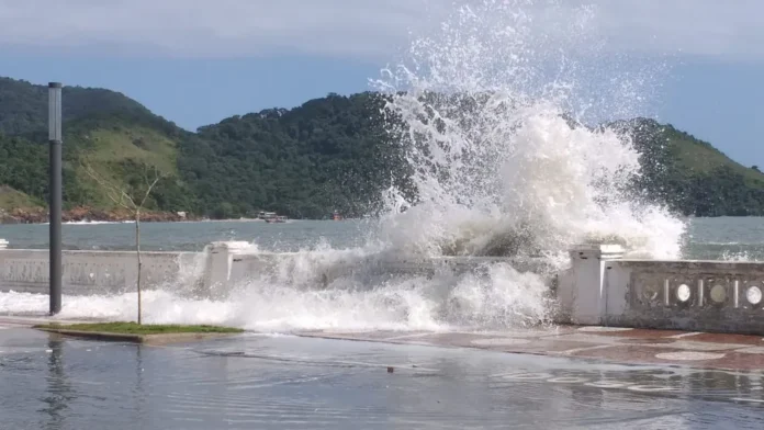 A orla de Santos poderá ter ondas de até 3 metros e aumento do nível do mar em até 50 centímetros nos próximos dias.