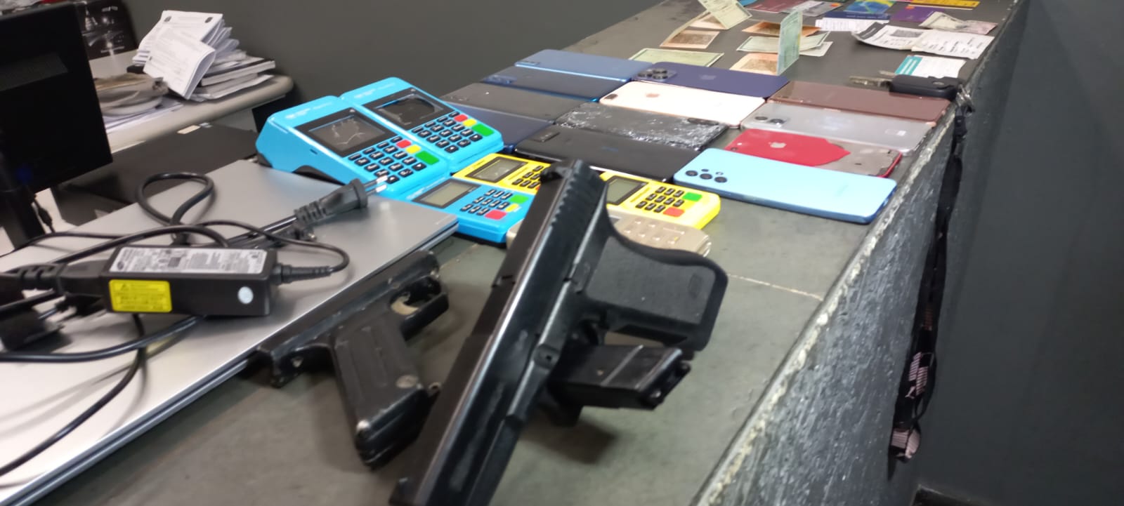 Uma quadrilha com nove pessoas foram presas em flagrante, durante ação da Polícia Militar na comunidade do México 70, em São Vicente, neste sábado (14/10). Eles eram especialistas na prática de sequestro e também por praticarem extorsão de valores via PIX. Também houveram apreensões de uma grande quantidade de drogas, simulacros de arma de fogo, 12 celulares, máquinas de cartão, seis documentos de vítimas de roubo, mais seis cartões bancários, munições e um computador. Os produtos eram guardados em um casarão.