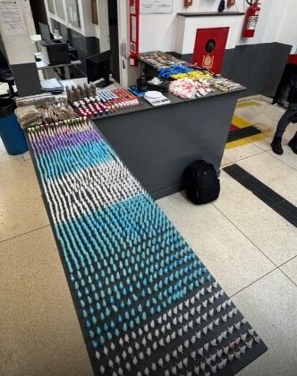 Em uma escadaria em área de mata, os agentes encontraram uma mochila preta escondida. Dentro dela, havia diversos entorpecentes prontos para comercialização, sendo eles, 5,2 kg de maconha, 1,5 kg de cocaína, 13g de haxixe, 140g de crack.