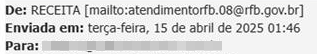 Os e-mails do atendimento da Receita Federal, como o [email protected], não são usados para envio de mensagens de cobrança, de alerta ou de orientação. Esses e-mails são usados apenas para responder demanda originariamente encaminhada pelo próprio contribuinte.