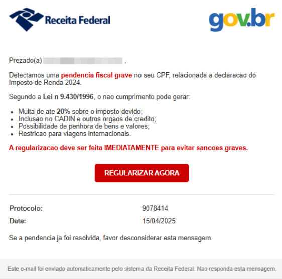 Assim como em outros golpes, os criminosos utilizam elementos visuais semelhantes aos da Receita Federal, incluindo logotipos, cores e linguagem técnica, para dar credibilidade à mensagem. Também destacam em vermelho termos como “pendência fiscal grave”, “sanções graves”, “imediatamente” e “regularizar agora” para induzir a vítima ao pânico e à tomada de decisão imediata.