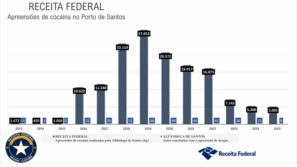 Confira abaixo o gráfico disponibilizado pela Receita Federal sobre as apreensões de cocaína nos últimos anos: