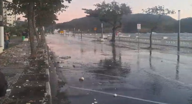 Em Santos, a alta da maré, provocou alagamentos em trechos das avenidas da praia, que ficaram intransitáveis e levaram a Companhia de Engenharia de Tráfego (CET-Santos) a realizar desvios de trânsito pelas vias paralelas à orla.