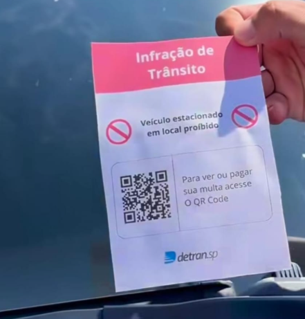 Abaixo do aviso do estacionamento irregular, o aviso traz uma mensagem que antecede um QRCode informando que para ver a multa e pagá-la é necessário escanear o código.