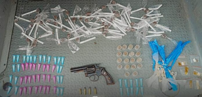 Com o suspeito, foi encontrada uma arma calibre 32, com numeração suprimida e munições. Na residência, foi localizada uma sacola contendo 55 cigarros com porções de Bombril, 59 eppendorfs de cocaína, 34 porções de skank, 5 porções de merla e 55 pedras de crack, indicando atividades de tráfico.