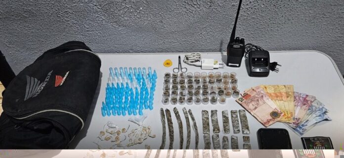 Durante a revista, os agentes encontraram diversas porções de drogas, entre maconha, cocaína, skank e crack, além de R$ 176 em dinheiro, um aparelho celular e um rádio comunicador.