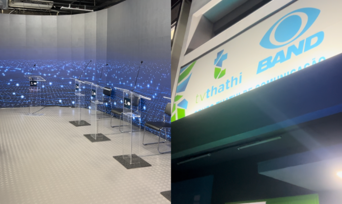Já é possível ver como está o estúdio, com os púlpitos posicionados, para em breve receber Nando Pinheiro (AVANTE), Rogério Santos (REPUBLICANOS), Rosana Valle (PL) e Telma de Souza (PT) para esta noite histórica.