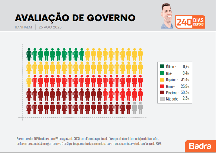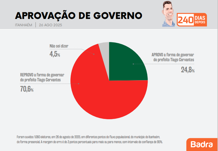 Segundo pesquisa do Instituto Badra, o prefeito de Itanhaém, Tiago Cervantes, tem a aprovação de 24,8% da população em relação aos primeiros oito meses do ano.