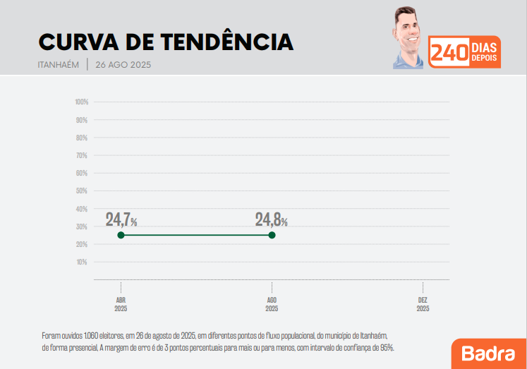 Foram ouvidos 1.060 eleitores no dia 26 de agosto de 2025, a partir de 16 anos até mais de 60, em diferentes pontos do município de Itanhaém, de forma presencial.