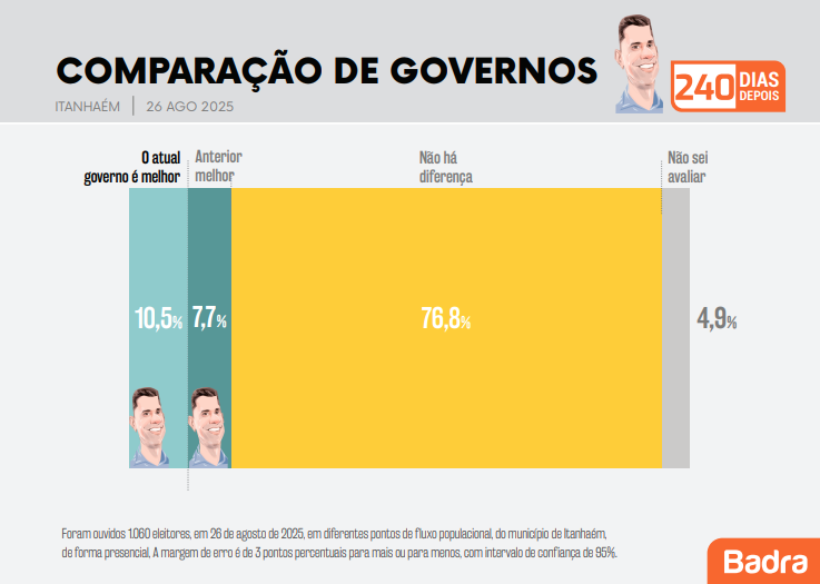Nas comparações entre a gestão atual e a anterior, 10,5% dos eleitores escolheram o atual governo, em relação a 7,7% que escolheram a gestão anterior. Para 76,8% não há diferença entre os dois governos.