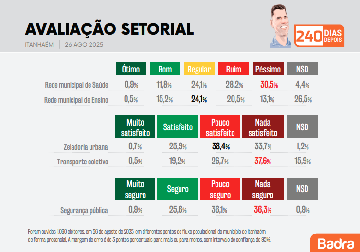 Na avaliação setorial, a rede municipal de saúde é considerada péssima com 30,5%, já a rede municipal de ensino é considerada regular com 24,1%. Na área da Zeladoria, 38,4% dos entrevistados afirmaram estar pouco satisfeitos, assim como no transporte público coletivo, que 37,6% dos entrevistados alegaram estarem nada satisfeitos com o serviço oferecido.