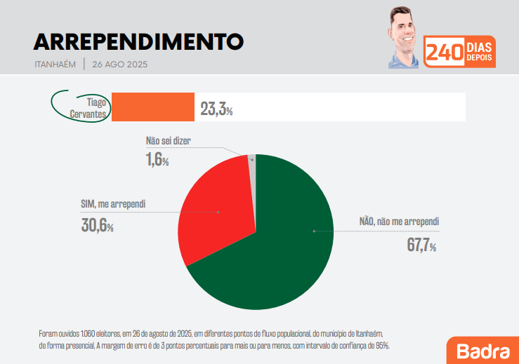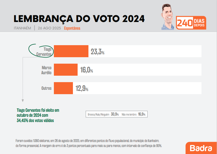 Tiago Cervantes foi eleito em outubro de 2024 com 34,45% dos votos e 23,3% afirmaram ter a lembrança de votar no atual prefeito. Dos eleitores, 67,7% afirmam não se arrepender de terem escolhido Tiago Cervantes para governar a cidade.