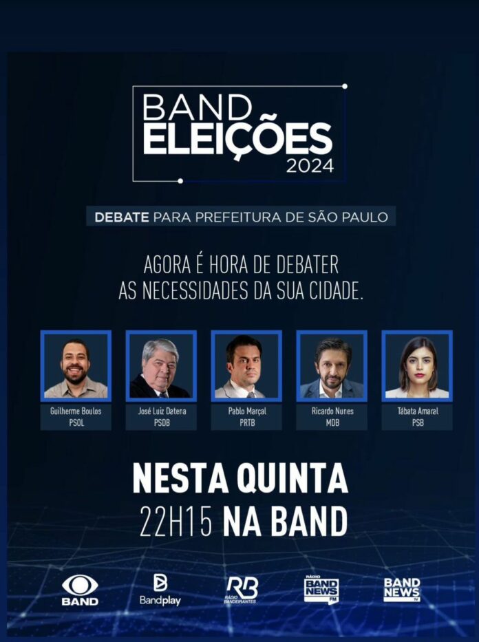 Os candidatos Guilherme Boulos (PSOL), José Luiz Datena (PSDB), Pablo Marçal (PRTB), Ricardo Nunes (MDB) e Tábata Amaral (PSB) estarão ao vivo, debatendo sobre as necessidades da cidade mais populosa do Brasil, e a capital do estado.