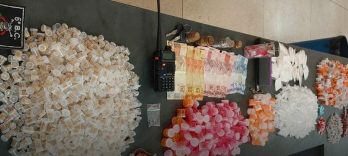 Um deles foi alcançado e abordado. Durante a revista, os policiais encontraram com ele um rádio comunicador, R$225,00 entre notas e moedas e uma grande quantidade de entorpecentes, sendo 685 porções de cocaína, 127 porções de maconha, 1184 porções de crack, 190 porções de Dry Ice, oito porções de haxixe, dois comprimidos de ecstasy e 112 porções de K2.