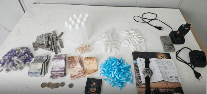 Os agentes resolveram abordar os indivíduos e com eles foram encontradas grandes quantidades de drogas, além de um rádio comunicador, dinheiro em espécie, uma balança, anotações do tráfico e um relógio.