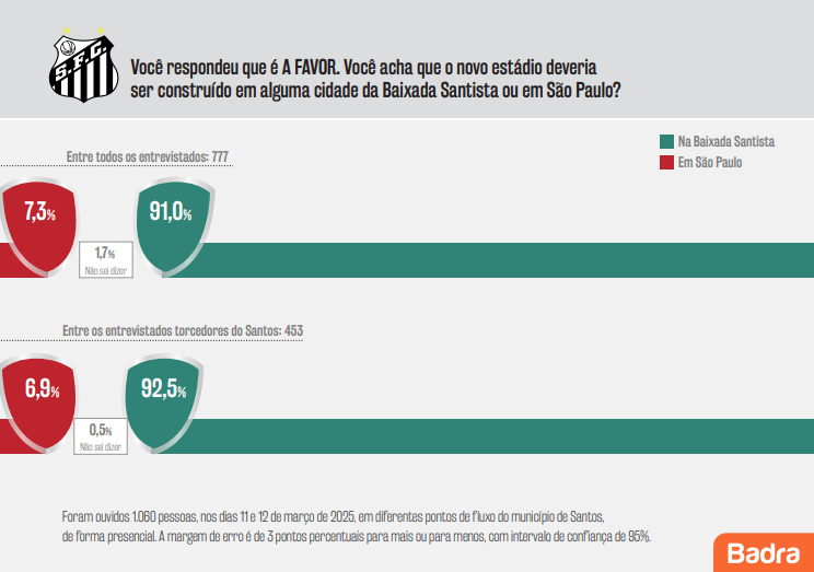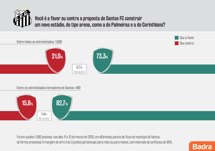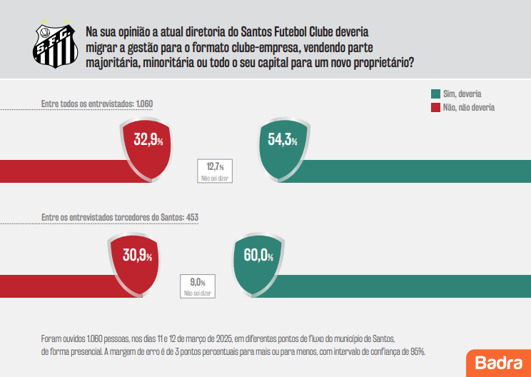 O levantamento ouviu 1.060 moradores de Santos (entre eles 453 torcedores do Santos FC), selecionados a partir de cotas para gênero e faixa etária, em diferentes pontos de fluxo do município, nos dias 11 e 12 de março. A margem de erro da pesquisa é de três pontos percentuais para mais ou para menos, com intervalo de confiança de 95%.