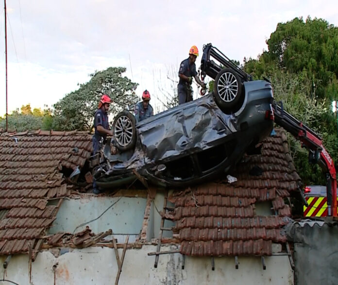 De acordo com o proprietário da casa, o motorista perdeu o controle do automóvel na rua Anna Bogon Dressler ao fazer a curva. O carro subiu no barranco, capotou no ar e caiu em cima do telhado.