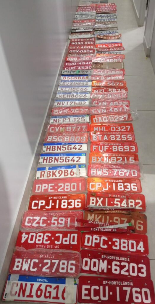 Em um cômodo, foi localizada uma caixa contendo inúmeras placas veiculares sem procedência, além de pinos marcadores de chassis, plaquetas identificadoras em branco, pedaços de chassi recortados com uso de solda, além de farta documentação referente à emplacamento de caminhões.