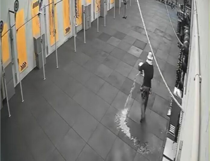 Imagens de câmeras de segurança mostram que, no início da tarde, um homem usando chapéu e blusa preta circulava pela academia carregando um galão. Em seguida, ele despeja um líquido — provavelmente inflamável — e o incêndio tem início.