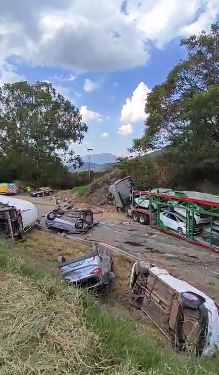 Um caminhão cegonha carregado com veículos e um caminhão tanque tombou na rodovia Fernão Dias, em Bragança Paulista. O condutor de um dos veículos foi socorrido em estado moderado pelas equipes de resgate.
