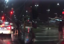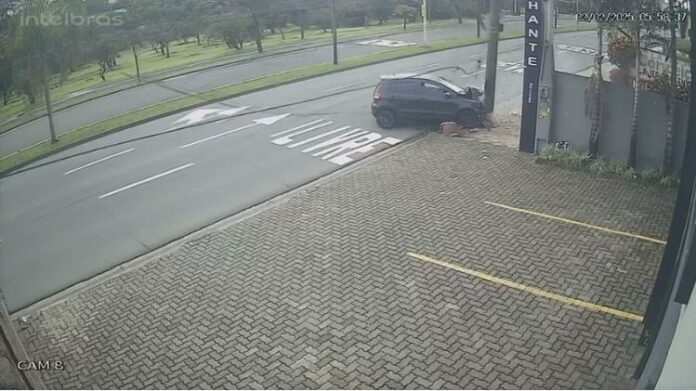 Nas imagens gravadas pela câmera de segurança de um estabelecimento comercial da para ver o exato momento em que o motorista do carro perde o controle da direção e atinge o poste de iluminação pública.