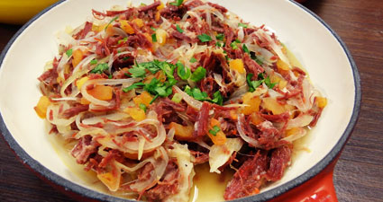 Doure na manteiga, alho, cebola e a gordura reservada com alguns pedaços de carne desfiada. Coloque a farinha e frite e pronto, o prato já estará pronto para fazer o maior sucesso em sua refeição!