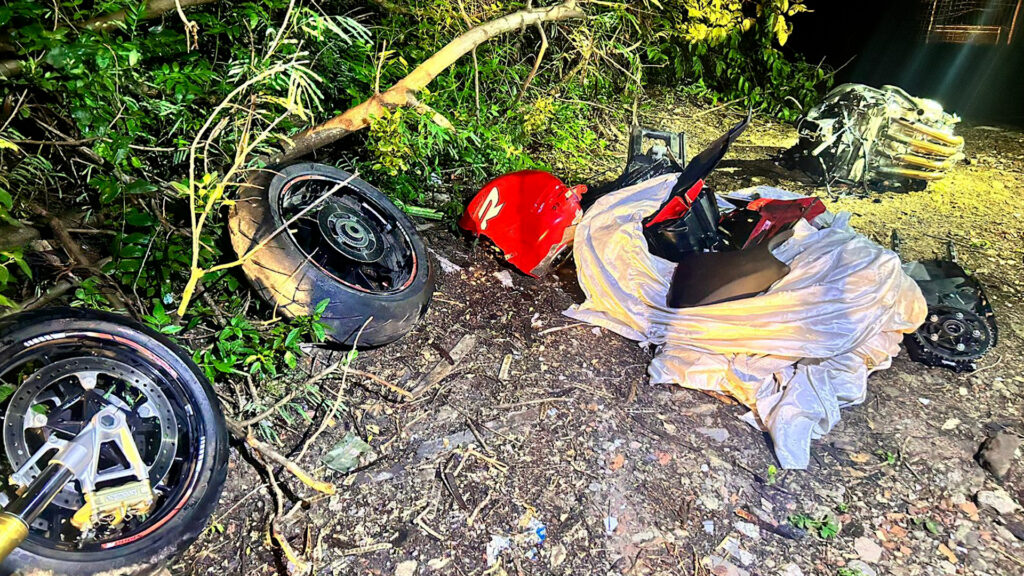 Os policiais aguardaram na casa mas uma equipe saiu em diligência a procura do veículo e encontraram a motocicleta toda desmontada em uma área de mata.